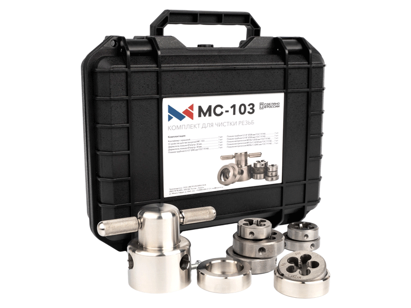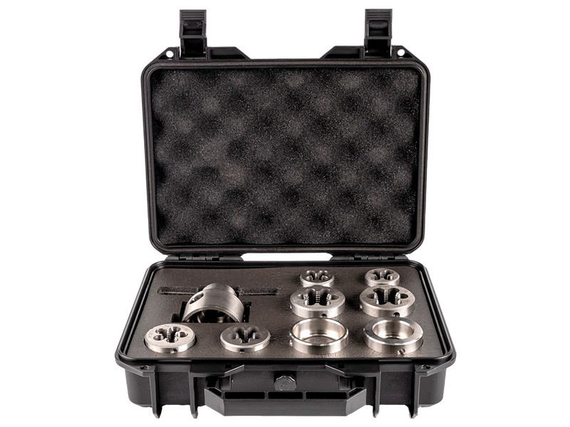 Плашки имеют различный диаметр, габариты и шаг резьбы. Комплект плашек М20х1,5; М12х1,5; М10х1; G1/2; G1/4; G1/8.